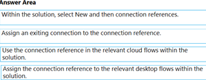 DRAG DROP You create a solution within a Microsoft Power Platform environment. The environment includes all connections required for the solution.