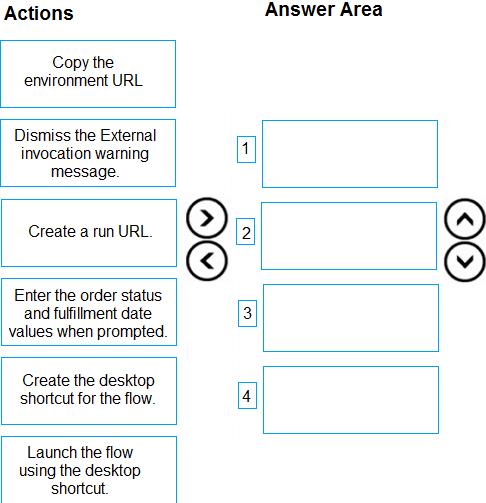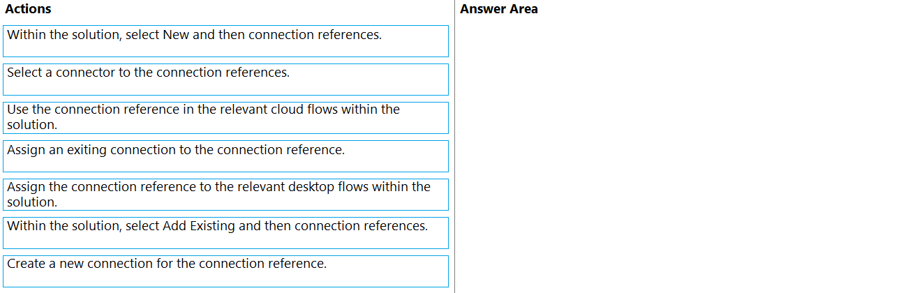 DRAG DROP You create a solution within a Microsoft Power Platform environment. The environment includes all connections required for the solution.
