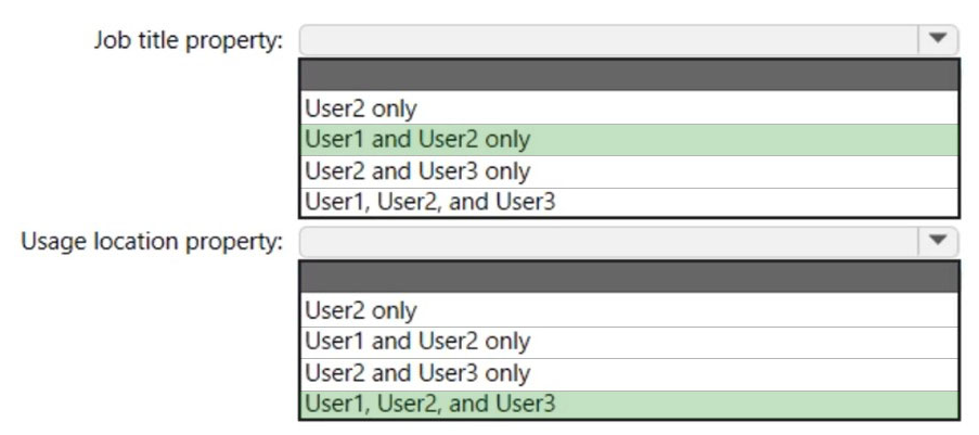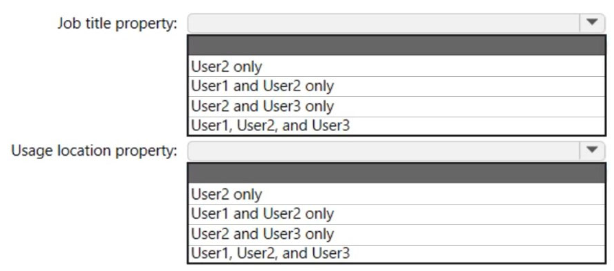 For which users can you configure the Job title property and the Usage location property in Azure AD? To answer, select the appropriate options in the answer area.