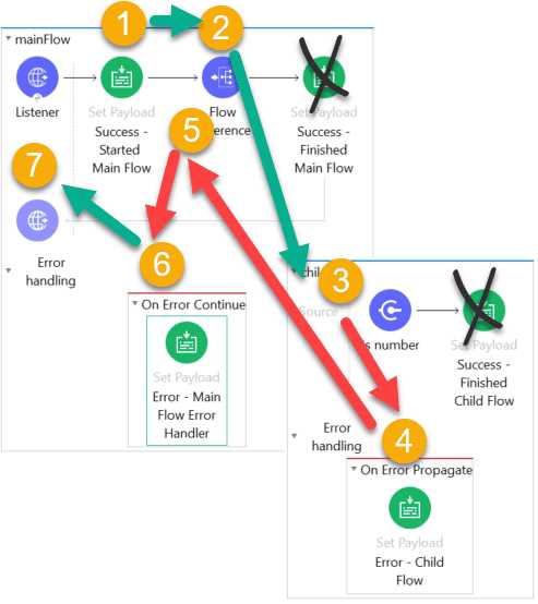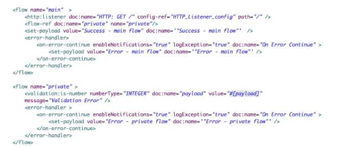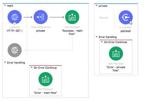 The main flow is configured with their error handlers. A web client submit a request to the HTTP