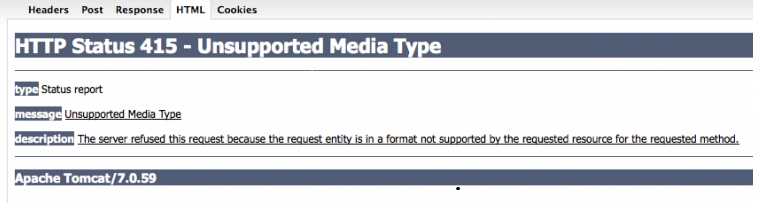 The HTTP 415 Unsupported Media Type client error response code indicates that the server refuses