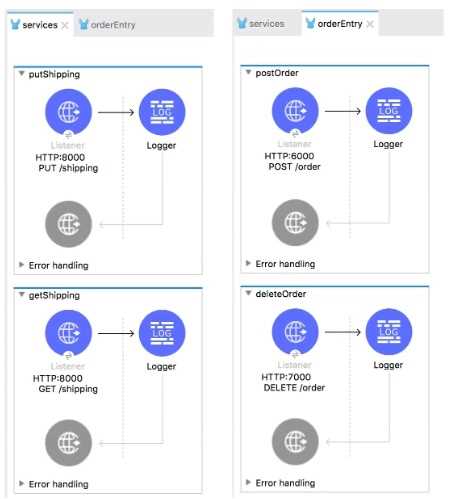 The two Mule configuration files belong to the same Mule project. Each HTTP Listener is configured