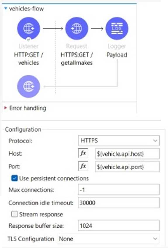 The flow is invoicing a target API. The API’s protocol is HTTPS. The TLS configuration in the HTTP