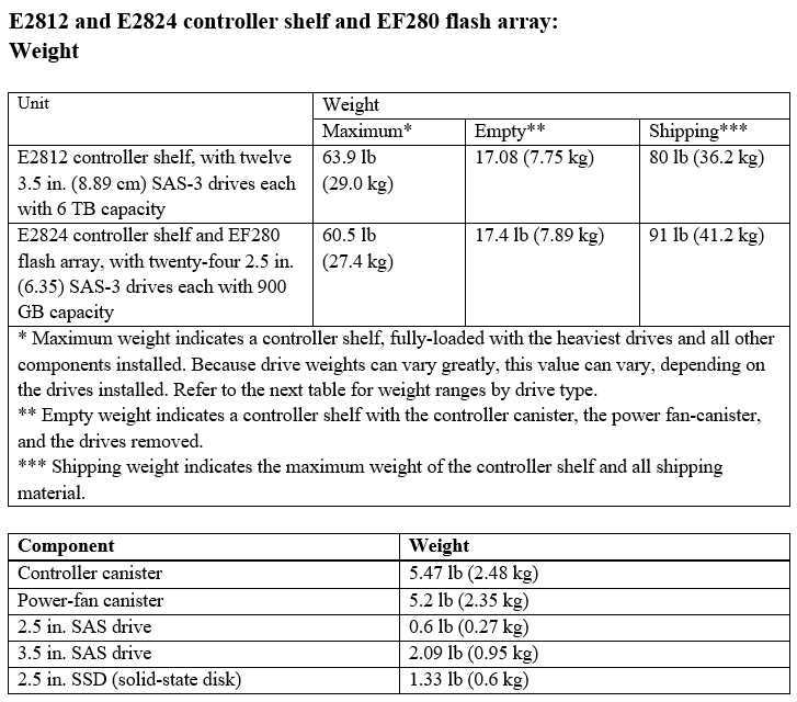 Reference: Weight table for E2824 controller shelf and EF280 flash array.