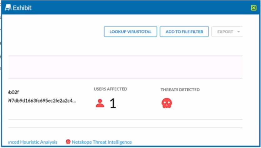 You are at the Malware Incident page. A virus was detected by the Netskope Heuristics Engine. Your