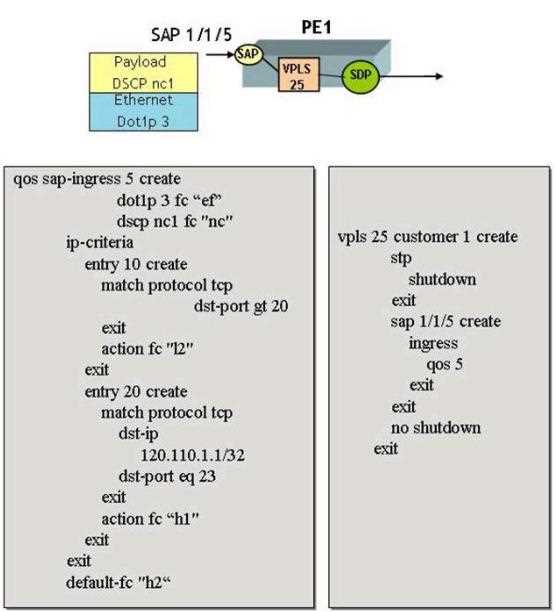 Click the exhibit button below. Based on the configuration shown below, name the forwarding class to be associated with a TCP packet encapsulated inside an Ethernet frame that arrives on SAP 1/1/5 with the following characteristics: Destination IP address = 120.110.1.1 TCP port number = 23 DSCP value = nc1 Dot1pvalue = 3