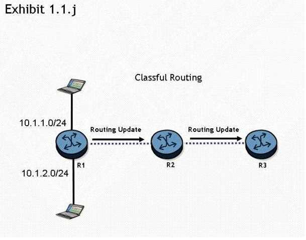 Click the exhibit button. Routers R1 „ R2, and R3 are running a classful routing protocol between them. Assuming that router R1 advertises all directly connected networks, how will these networks be represented in router R3's routing table?