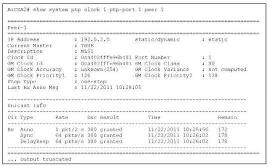 Click on the exhibit. Given the show command results shown: With what IEEE 1588v2/Precision Time Protocol (PTP) v2 message did the slave node set the Unicast message rates used by the master?