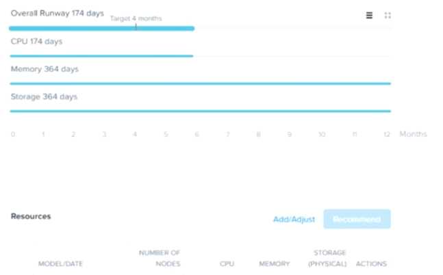 Refer to the exhibit. An administrator has been informed that a new workload will be deployed in six months with these characteristics. • CPU: 210 GHz • Memory: 600 GiB • Storage:11.72 TiB Upon receiving the new project notification, the administrator creates a scenario to determine whether or not the Nutanix cluster has enough space capacity to properly handle the new workload. Why is the Overall Cluster runway showing that cluster resources are not exhausted (red color)?