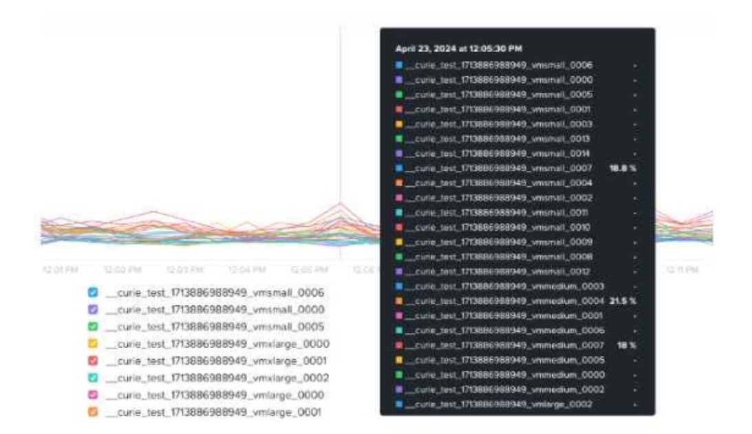The graph shows CPU Ready Time spikes for multiple VMs.