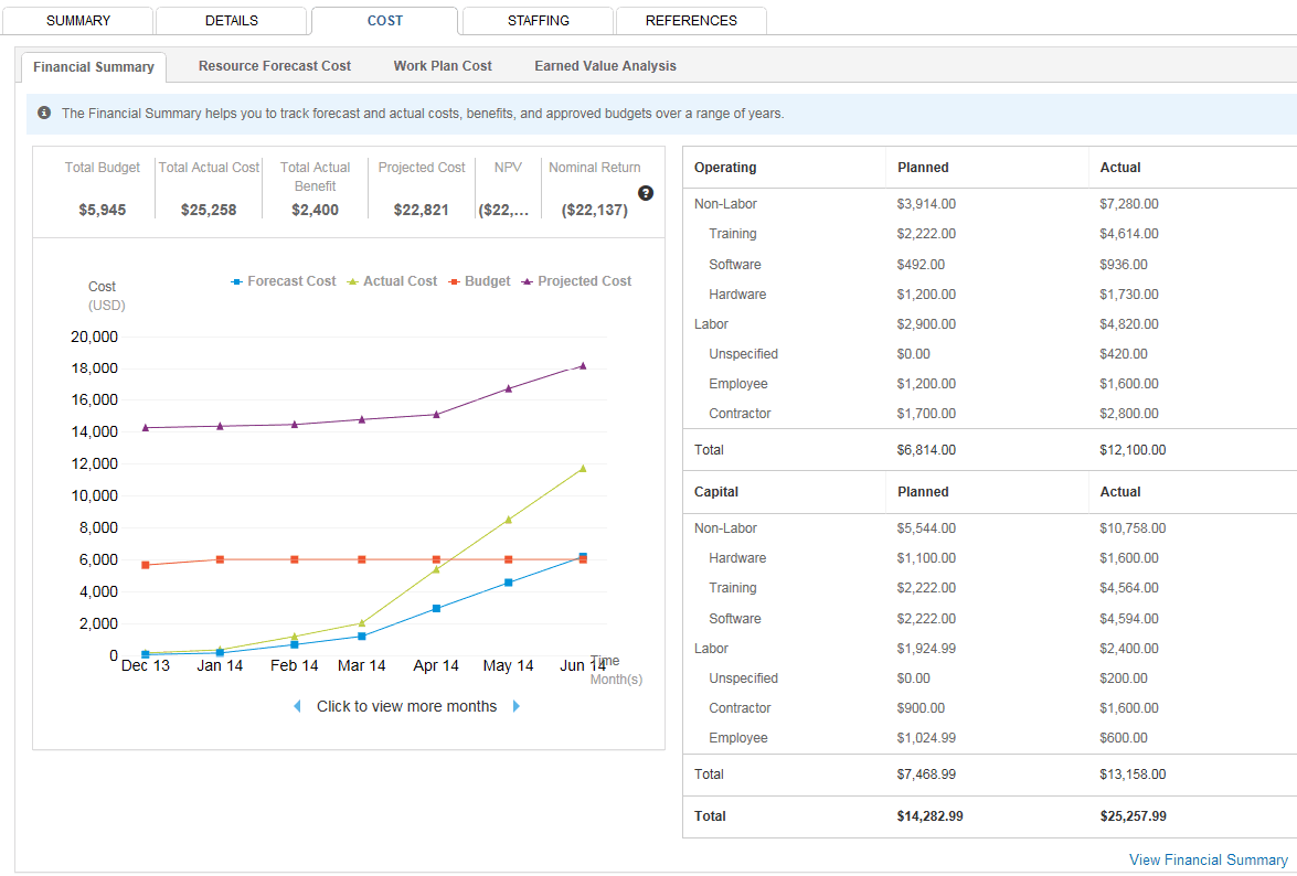Below is an example of the Financial Summary view on the Cost tab of the Project Overview page.