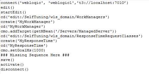 ers/MyWorkManager')cmo.setResponseTimeRequestClass(getMBean('/SelfTuning/wls_domain/Res
