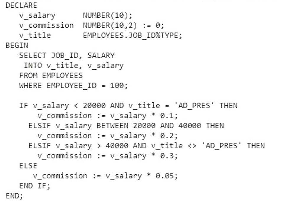 Examine this row of data from the EMPLOYEES table: Now, examine this block of code which executes successfully: What is the value of v_commission?