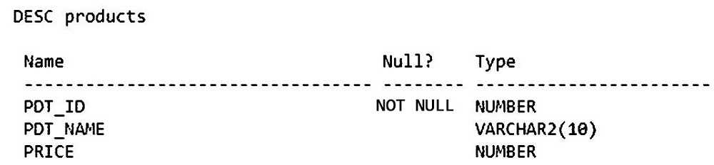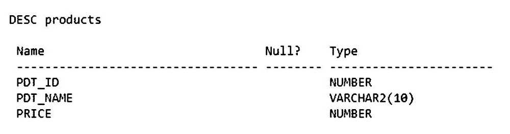 Examine the SH.PRODUCTS table: A row exists in SH.PRODUCTS with PDT_ID = 1. Now, examine this code and output executed by SH: Now, examine this block of code: Which error message(s) does it display on execution by user SH?