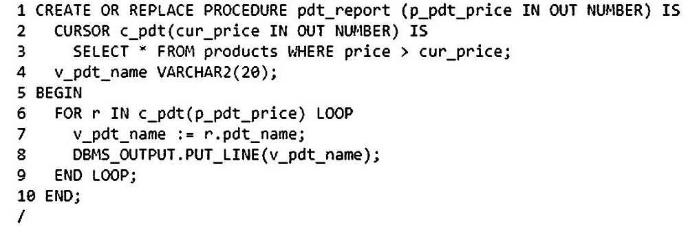 In line 6, replace P_PDT_PRICE parameter name with CUR_PRICE.