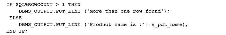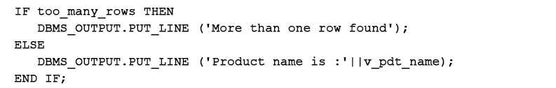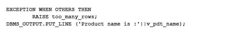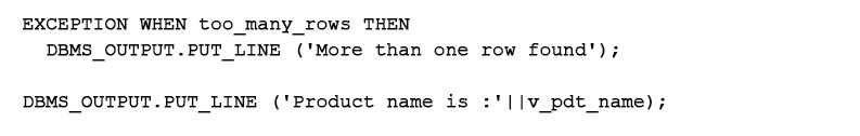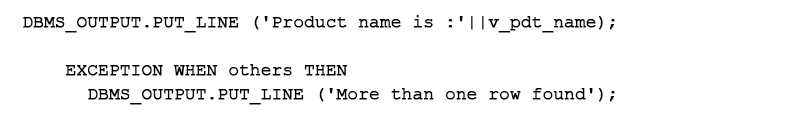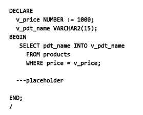 Examine this table in the SH schema: User SH executes this code: The program must terminate with a user-defined message and no rows displayed if more than one product's price is 1000. With which option must “---placeholder” be replaced? A. B. C. D. E.