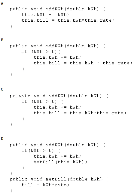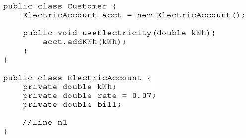 Given these two classes: Any amount of electricity used by a customer (represented by an instance of the Customer class) must contribute to the customer's bill (represented by the member variable bill) through the useElectricity method. An instance of the Customer class should never be able to tamper with or decrease the value of the member variable bill. How should you write methods in the ElectricAccount class at line n1 so that the member variable bill is always equal to the value of the member variable kwh multiplied by the member variable rate?