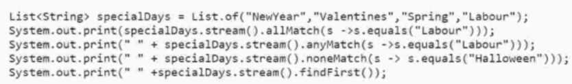 The code fragment is using the stream methods allMatch, anyMatch, noneMatch, and findFirst on a