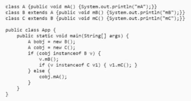 the object is not an instance of class C, so the output will be “mA”. Reference:
