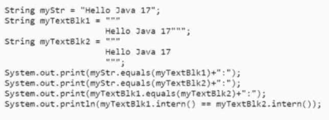 “Hello Java 17” == s2: This returns false because “Hello Java 17” is a string literal, which is