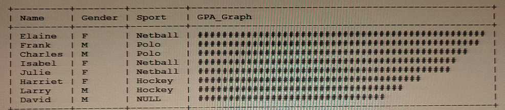 SELECT Name, Gender, Sport, RPAD ('# ' GPA*10) AS GPA_Graph FROM players ORDER BY GPA DESC;