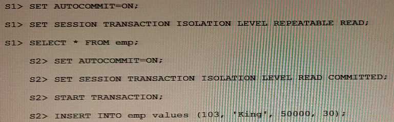 Examine these commands which execute successfully in the sequence shown in Sessions S1 and S2: Now, examine this statement that execute successfully in s1: S1> SELECT * FROM emp; Which is true about the result of the select statement?