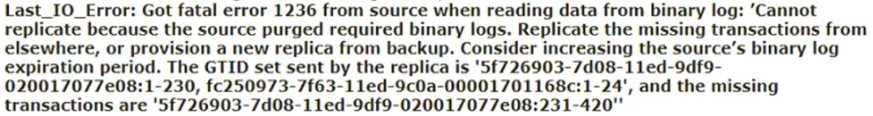 You have an inbound replication channel that replicates data from one DB system to another DB system. Both DB systems are created with the default configuration. You encountered the following error on the target DB system: What is the possible cause?