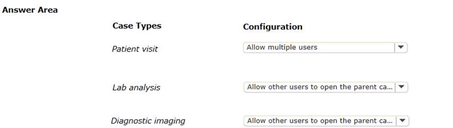 A hospital uses a Patient visit case type to track patient visits to the Emergency Room (ER). The case type can create Lab analysis and Diagnostic imaging child cases. While the child cases are active, the attending doctor or nurse must be able to update the patient visit case with notes and treatment recommendations. In the Answer Area, select the configurations which allow a doctor or nurse to update the parent case while lab and imaging technologists perform assignments on their respective child cases.
