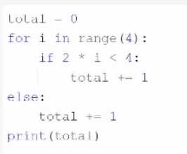 ends when “i” reaches 3, and the code prints the final value of “total” to the screen.