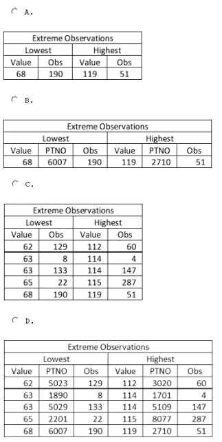 Given the data set WORK.BP with the following variable list: Which output will be created by the program?