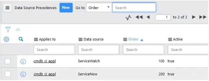 Assuming Reconciliation Rules (Reconciliation Definitions) were configured exactly the same for both Data Sources, ServiceNow and ServiceWatch, for the Application [cmdb_ci_appl] table and the following Data Source Precedence Rules are configured. Which one of the following is true?