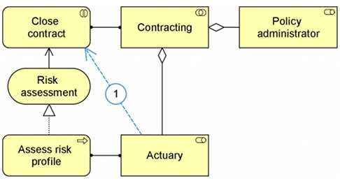Consider the following diagram: What is the strongest structural relationship that can be derived from business role Actuary to business interaction Close contract (indicated by number 1 in the diagram)?