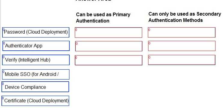 Drag and drop the authentication methods on the left into the correct classification on the right.