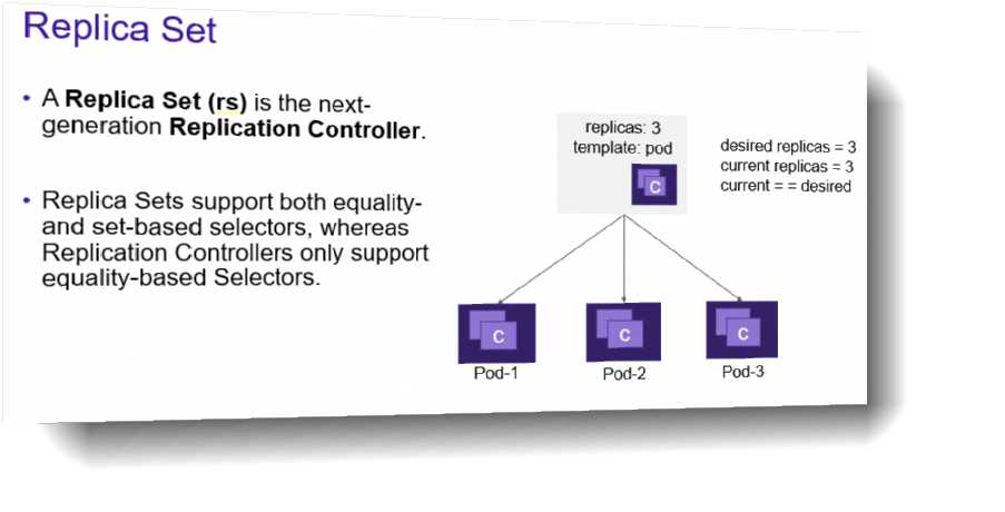 redundancy. The ReplicaSet ensures that a specified number of pods is kept running. Example:
