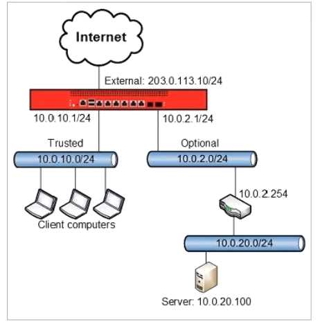 Clients on the trusted network need to connect to a server behind a router on the optional network. Based on this image, what static route must be added to the Firebox for traffic from clients on the trusted network to reach a server at 10.0.20.100? (Select one.)